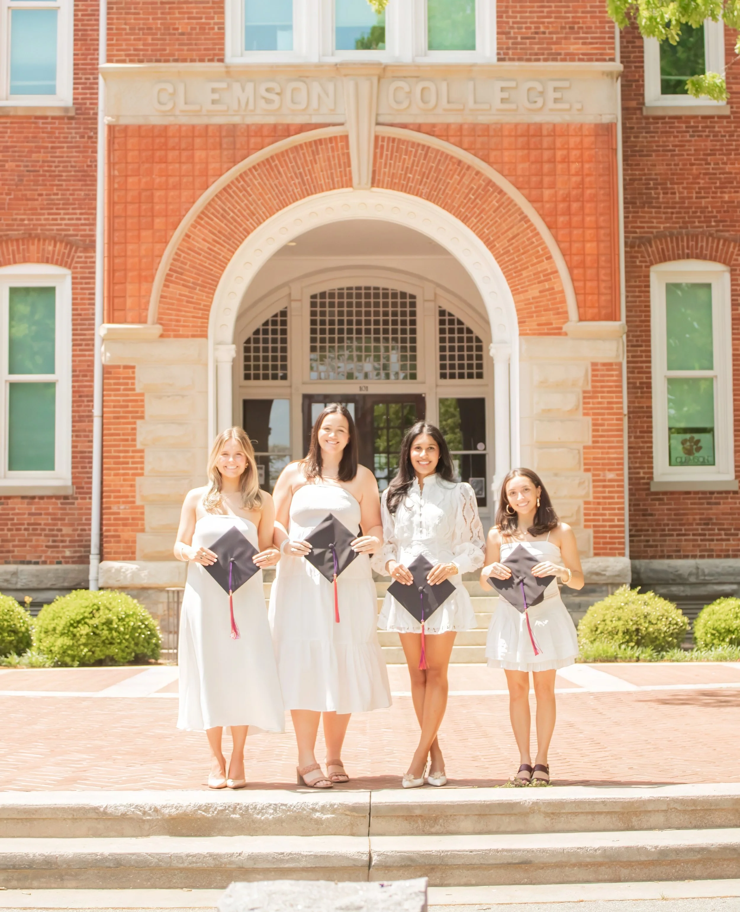 Four Clemson Seniors celebrating graduation outdoors on a sunny day, holding diplomas, standing on a flower bed in front of Tillman Hall with trees and a clear blue sky.