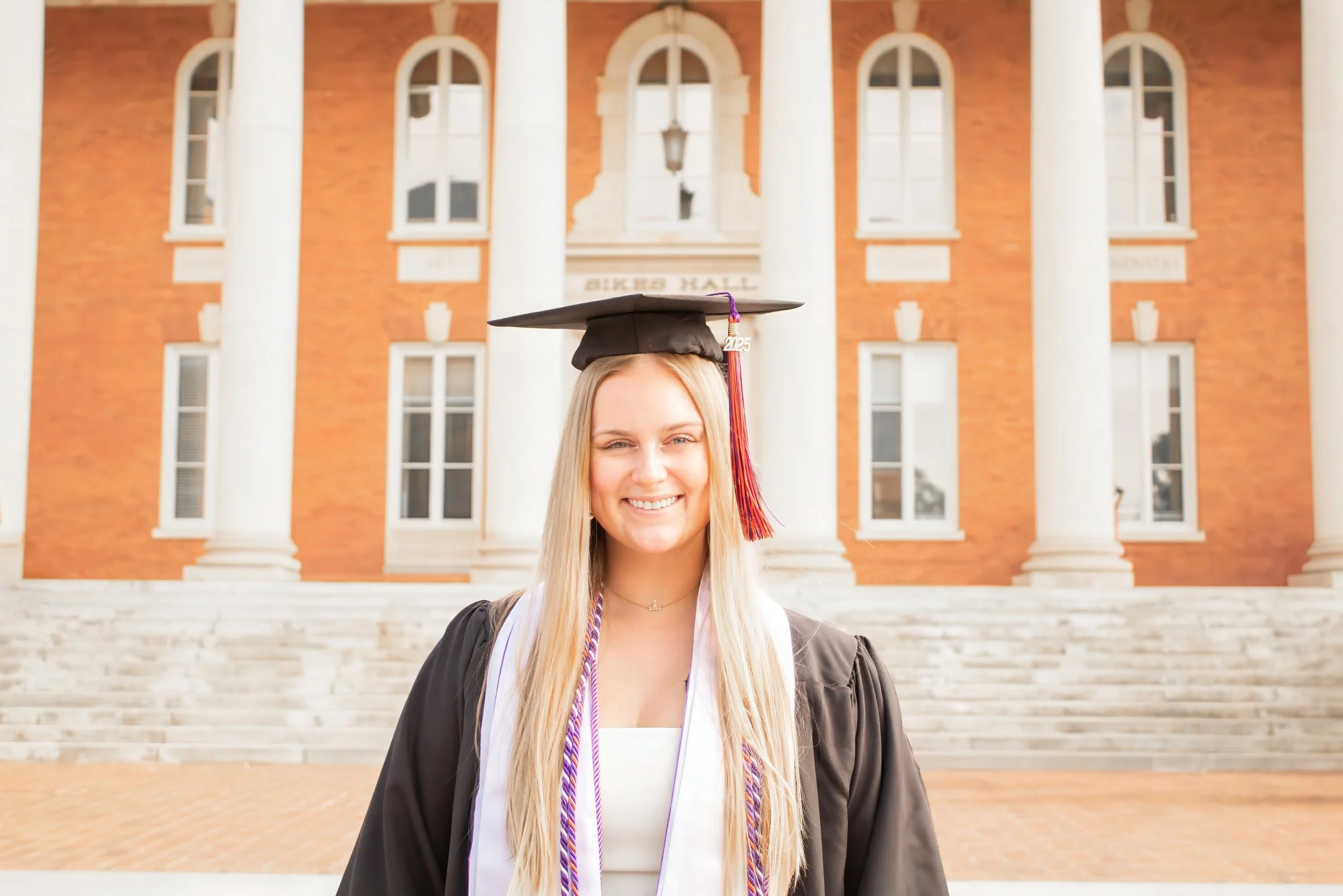 A young woman smiling and wearing a graduation cap and gown, standing in front of the large, historic Sikes Hall with white columns and stairs.